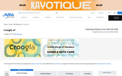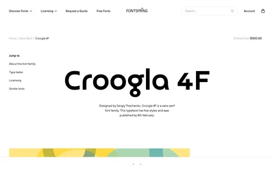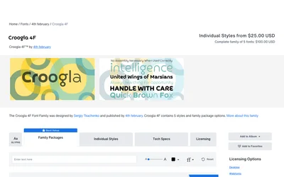 Croogla (full name Croogla 4F) is a geometric display typeface designed by Sergiy Tkachenko and published by the 4th february type foundry. The design features bold, clean geometric letterforms with a modern, technology-forward aesthetic suited to headlines, logos, and branding applications.