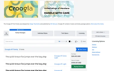 Sergiy Tkachenko created Croogla as a geometric sans-serif with pronounced display qualities. The typeface builds its visual identity on strong geometric principles — circular bowls, consistent stroke weights, and mathematically-informed proportions — while adding enough character to serve as a distinctive branding tool rather than a neutral text face.