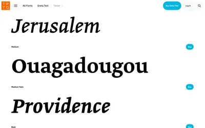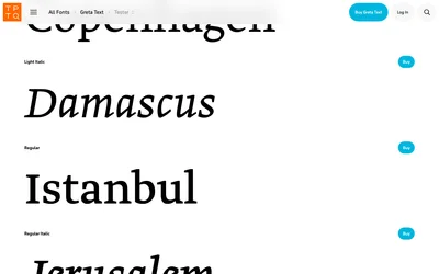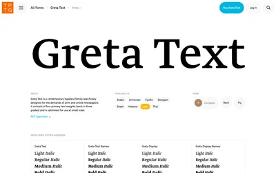 Greta Text features robust letterforms that perform reliably in the demanding conditions of newspaper printing and digital publishing. The typeface's moderate contrast and open counters ensure readability across various reproduction methods. Typotheque's extensive multi-script support makes Greta Text valuable for international publications.